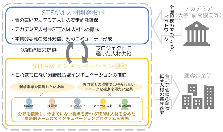 STEAM人材開発機能とインキュベーション機能の掛け合わせによって、STEAM人材に対しては多分野・他業種との実践経験を、企業に対しては新たな価値創造に必要なSTEAM人材との協働機会を提供します。なお、本プロジェクトでは、STEAM人材が学び合うことができるコミュニケーションスペースや、インキュベーションプロジェクトを通じて施設利用者が実践的に学びつつアウトプットするプロジェクトルームに加え、国内外に対する情報発信を行うことのできるカンファレンスホールを併設し、次世代の価値を集約・発信する拠点として、一体的な運用を行う予定です。
