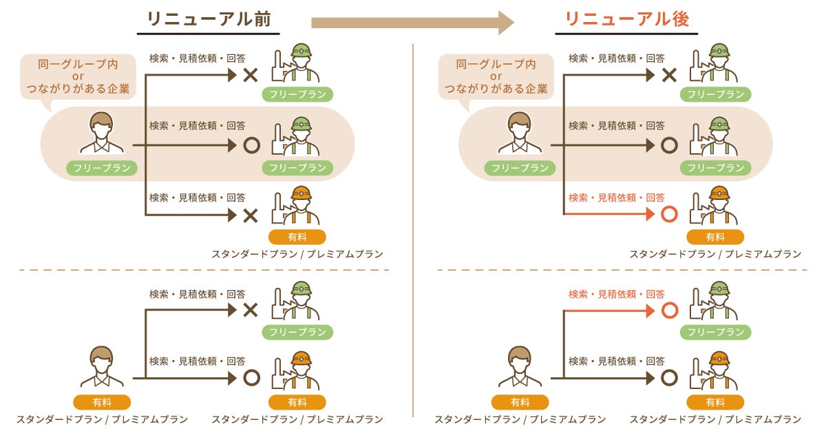 リニューアル前は、つながりのあるものづくり事業者と同じグループに所属しているものづくり事業者に対してのみ検索や見積依頼・回答が可能でした。リニューアル後は、上記に加え、有料のスタンダートプラン、プレミアムプランのものづくり事業者に対しても、検索や見積依頼・回答が可能になりました。
