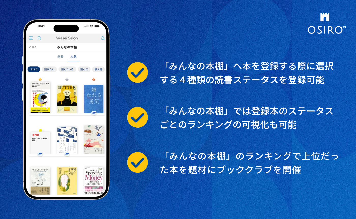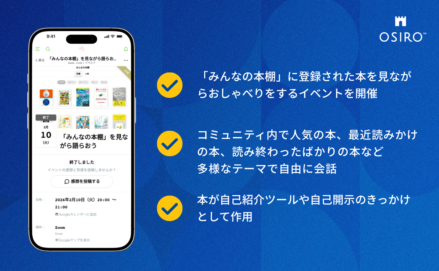 OSIROの「ブックログ」は読書記録が目的ではなく、本の登録(記録)から会話や交流のきっかけを作り、ブッククラブ(読書会)など本を通じた共体験を生み出し、メンバー同士のコミュニケーションを深めたいという思いが込められています。