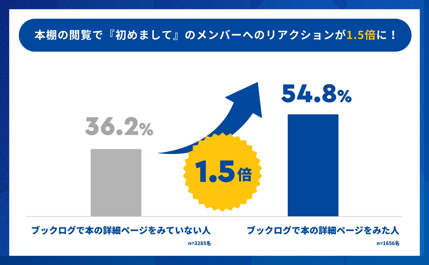 自社調査により、「みんなの本棚」で本の詳細ページを閲覧したユーザー(※)は、そうでないユーザーと比較して、これまで交流のなかった相手へのリアクション率が約1.5倍(36.2%→54.8%)向上することが分かりました。