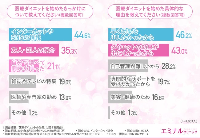 また、友人や知人の紹介や、自分で調べて興味を持ったことがきっかけで医療ダイエットを始めた方もいることが示されました。