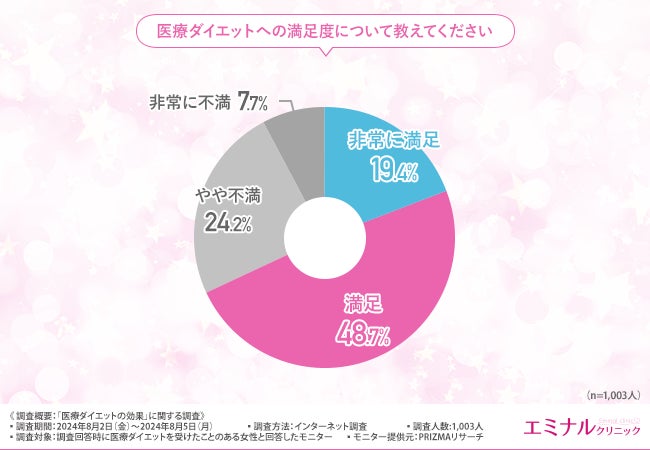 続いて、「医療ダイエットへの満足度について教えてください」と質問したところ、6割以上の方が『非常に満足(19.4%)』『満足(48.7%)』と回答しました。
