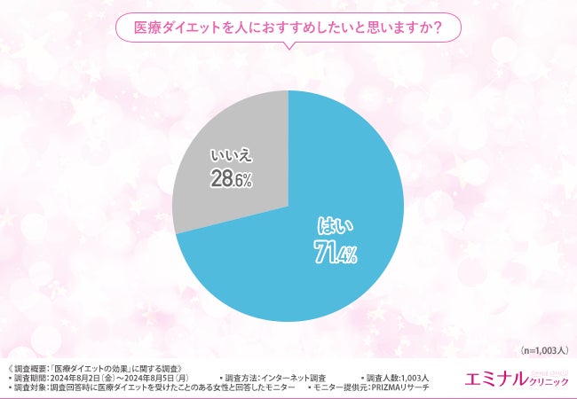 最後に、「医療ダイエットを人におすすめしたいと思いますか?」と質問したところ、7割以上の方が『はい(71.4%)』と回答しました。
