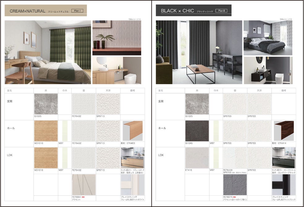 内装材には、お部屋の印象を左右するアクセントクロスや、デザインが豊富で本物さながらのリアルな質感が特長のフロアタイルを使用しています。ナチュラル・モダン・フレンチ・シックといった4パターンから、好みのインテリアを選ぶことができます。(空室状況などによる)