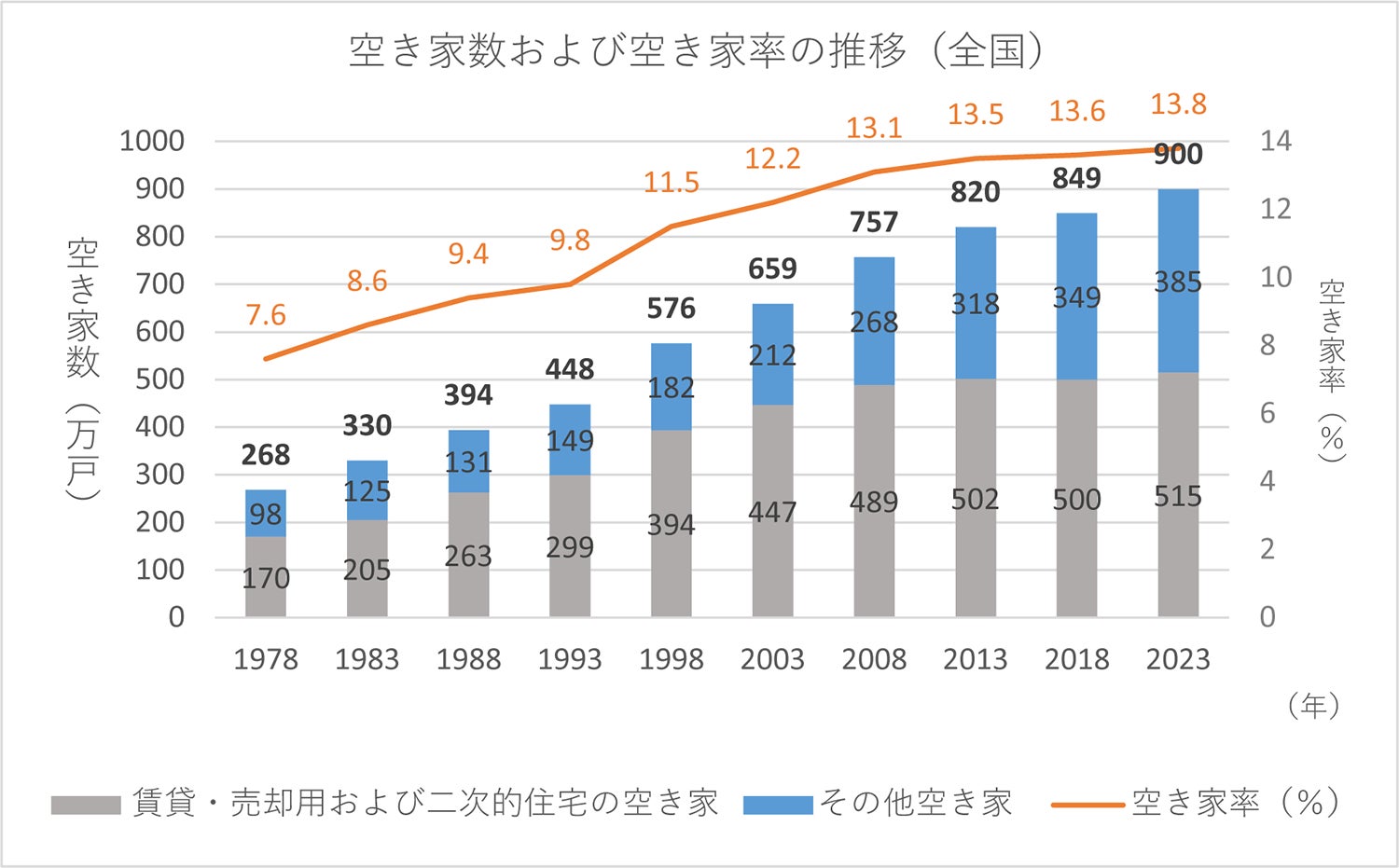 ・空き家数は900万戸と過去最多、2018年から51万戸の増加、空き家率も13.8%と過去最高