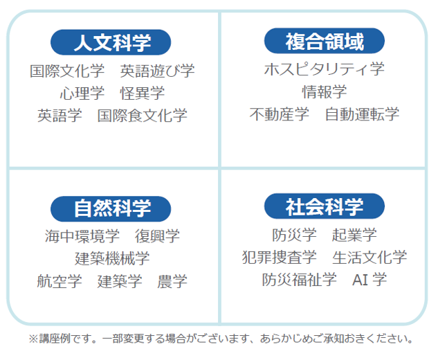 大学(ゼミ生含む)・企業・地域など様々な場所で活躍されている方々が講師を担当。「自動運転学」「里山保全学」「海洋環境学」「国際文化学」「住まい学」など年間約20講座を展開し、幅広い分野について講義やフィールドワークなどを通して学びます。