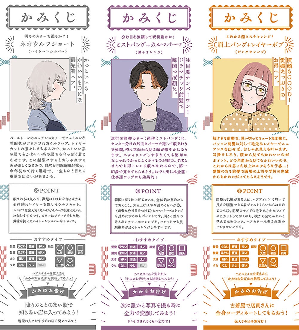「かみくじ」は髪の長さやカラー別に約50種類をご用意しています。「かみくじ」に書かれているのは、あなたの運命の「ヘアスタイル」と、その髪型の「オーダー情報」「”かみ”のお告げ」の3つが記載されています。