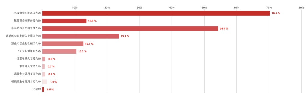 「老後資金を貯めるため」が70.4%で圧倒的に多かったが、「手元のお金を増やすため」も54.4%でこれに続いた。また、「定期的な安定収入を得るため」との回答も23.8%あった。