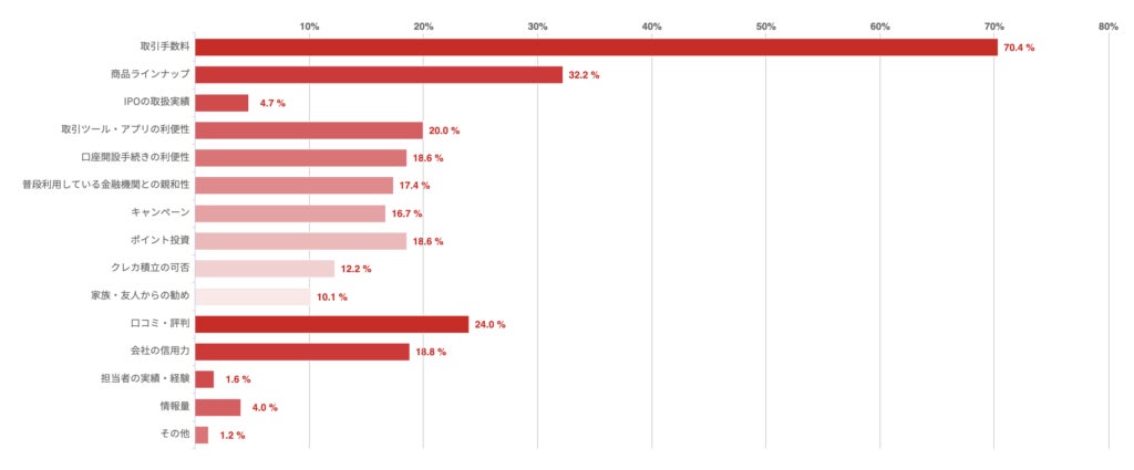 「取引手数料」が70.4%で圧倒的な票を集め、これに「商品ラインナップ」(32.2%)、「口コミ・評判」(24%)が続いた。その他、「取引ツール・アプリの利便性」「会社の信用力」なども挙げられた。