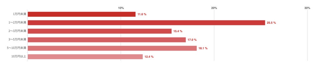 「1〜2万円未満」が最も多く25.5%だったが、「5〜10万円未満」と「3〜5万円未満」にもそれぞれ18.1%、17%と一定の回答があった。