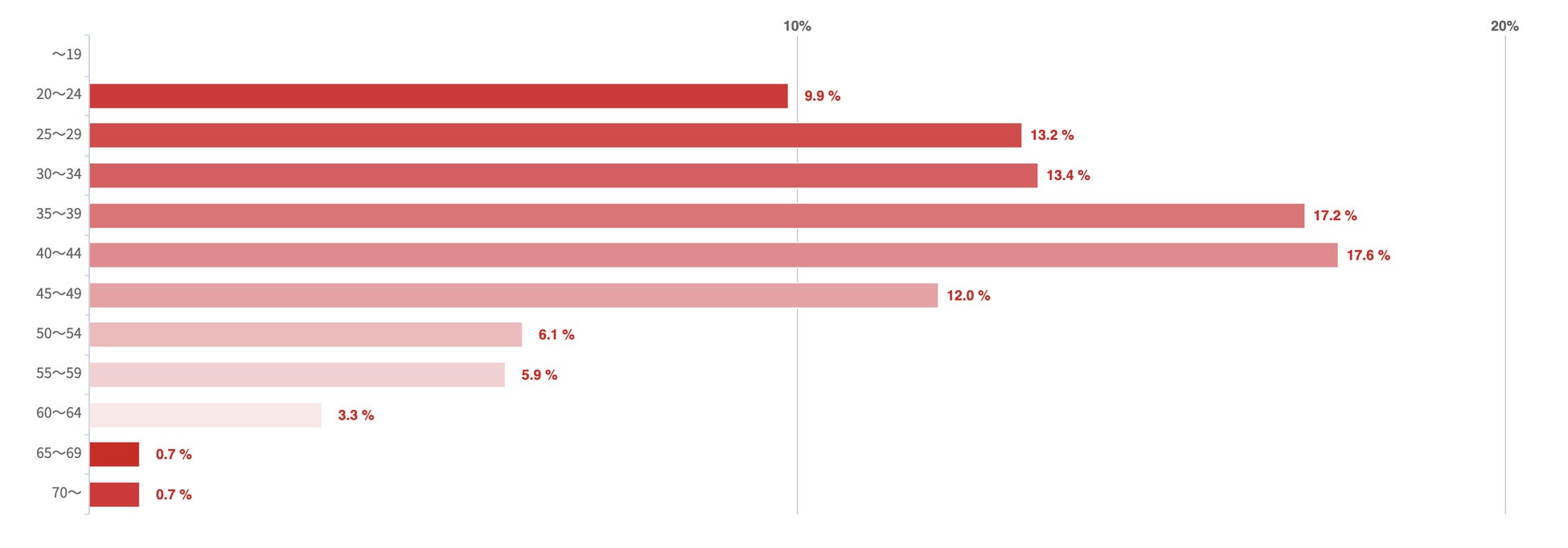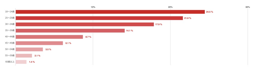 18〜24歳が24.5%で最も多く、25〜29歳が21.6%、30〜34歳が17.9%など、回答数は年齢順に続く結果となった。
