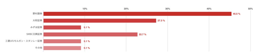 「野村證券」が最も多く45.5%であった。その他、「大和証券」が27.3%、「SMBC日興証券」が22.7%でこれに続いた。
