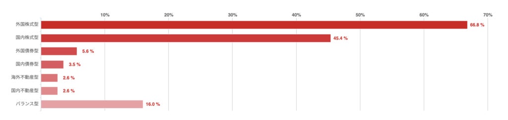 「外国株式型」が66.8%で最も多く、「国内株式型」が45.4%でこれに続いた。なお、「バランス型」との回答も16%あった。