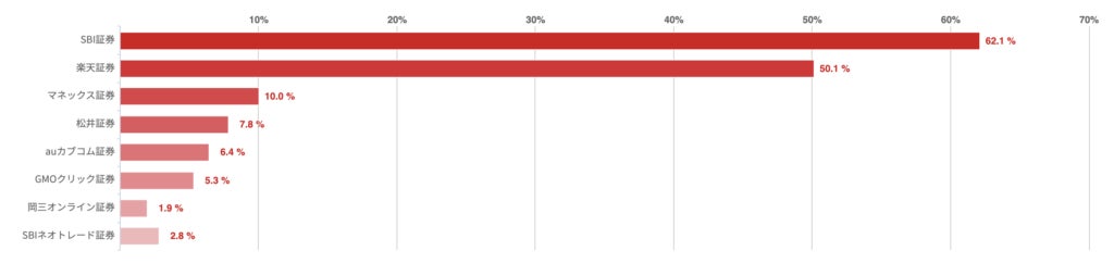 「SBI証券」が最も多く62.1%、「楽天証券」も50.1%でこれに続いた。なお、次に多かったのは「マネックス証券」(10%)だった。