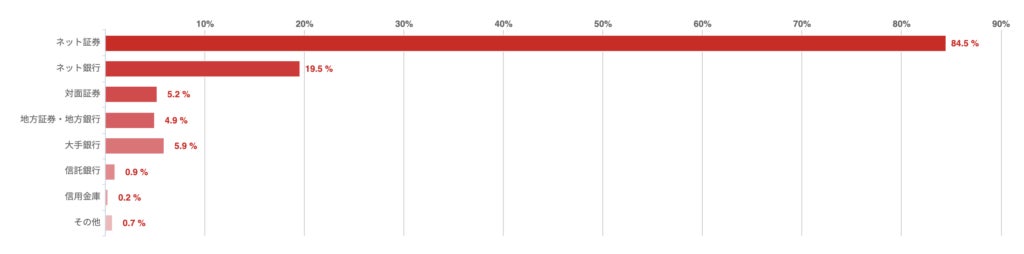 「ネット証券」が圧倒的な人気で約85%となった。その他、「ネット銀行」(19.5%)、「大手銀行」(5.9%)の順で続いた。