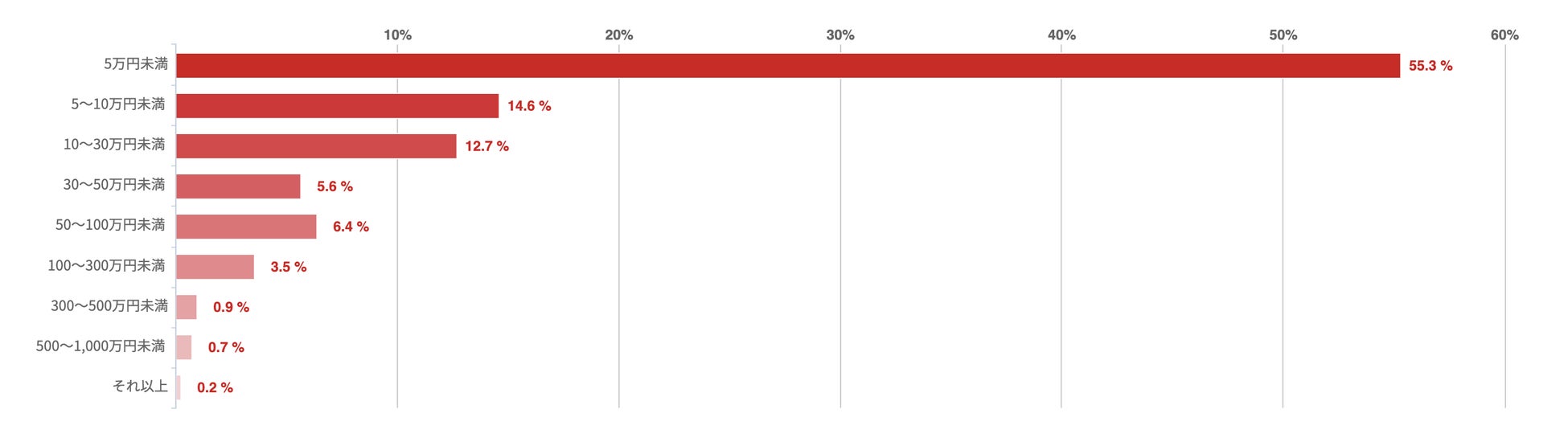 「5万円未満」が55.3%で圧倒的に多く、これに「5〜10万円未満」が14.6%、「10〜30万円未満」が12.7%で続くなど、概ね金額通りの順番になった。