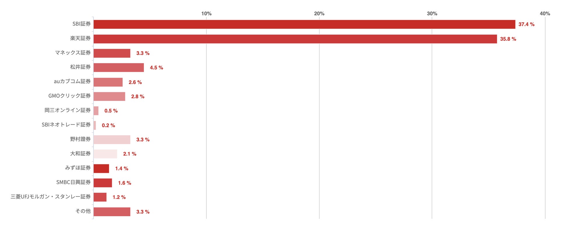 「SBI証券」(37.4%)と「楽天証券」(35.8%)がほぼ同数で並んだ。なお、次に多かったのは「マネックス証券」だったが、割合は4.5%に留まった。