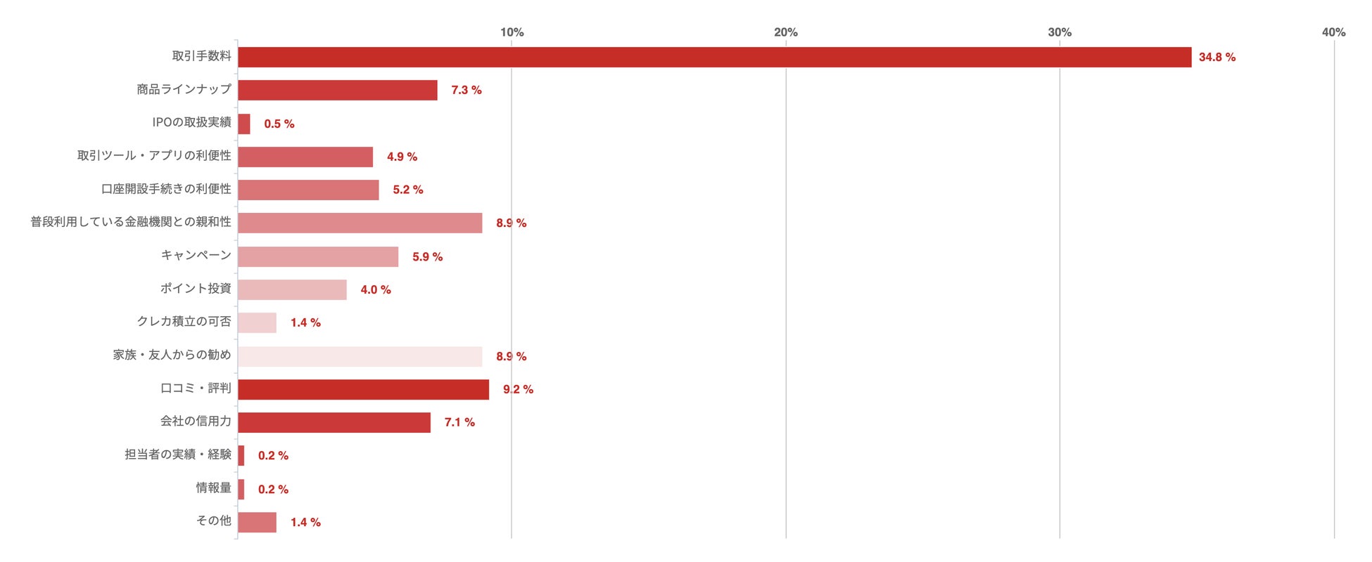 「取引手数料」が34.8%で圧倒的に多かった。その他には、「口コミ・評判」(9.2%)、「普段利用している金融機関との親和性」「家族・友人からの勧め」(共に8.9%)などの回答もあった。