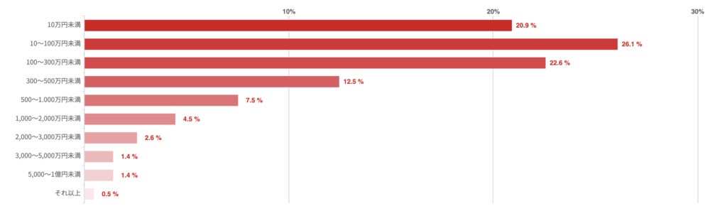 「10〜100万円未満」が最も多く26.1%だったが、「100〜300万円未満」と「10万円未満」もそれぞれ22.6%、20.9%とこれに迫る回答数があった。