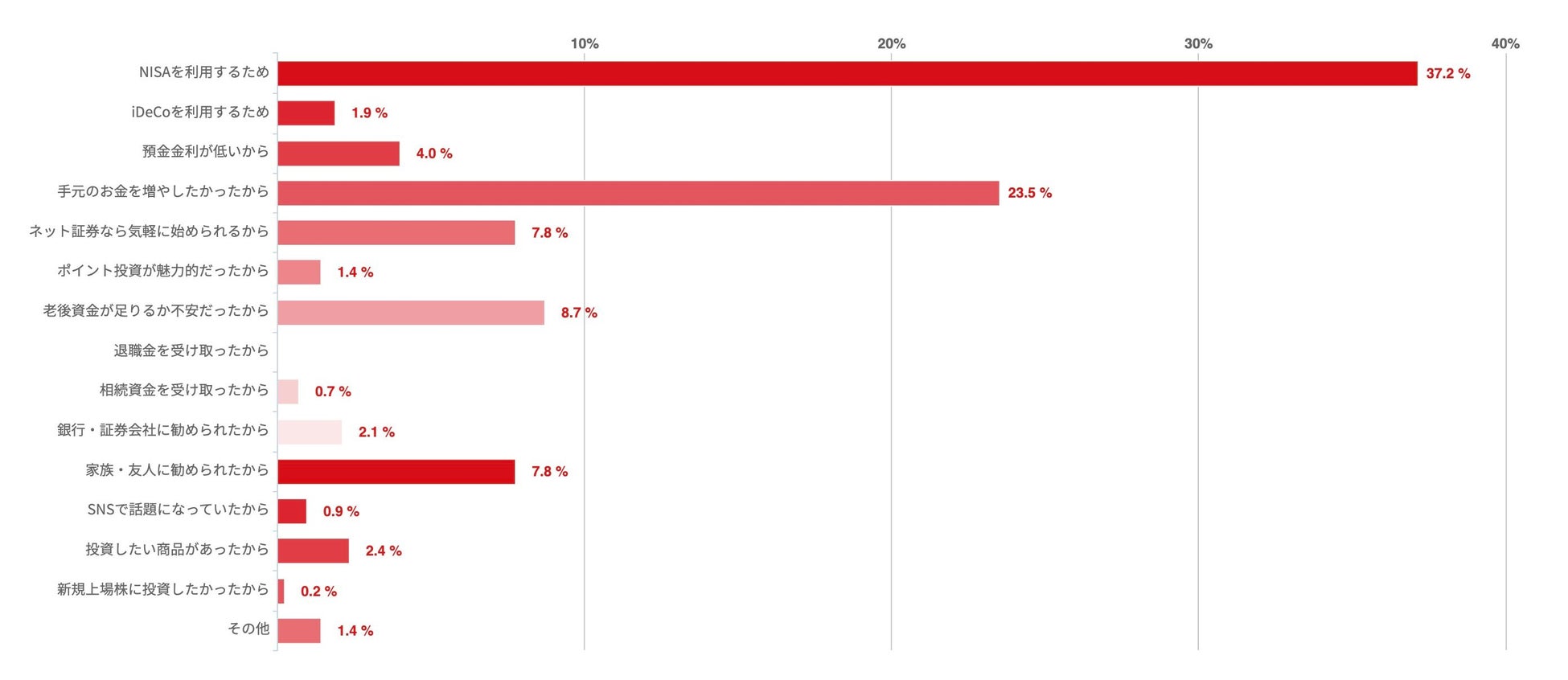 「NISAを利用するため」が37.2%で最も多く、「手元のお金を増やしたかったから」が23.5%でこれに続いた。なお、その他には「老後資金が足りるか不安だったから」(8.7%)、「ネット証券なら手軽に始められるから」「家族・友人に勧められたから」(共に7.4%)などの回答もあった。