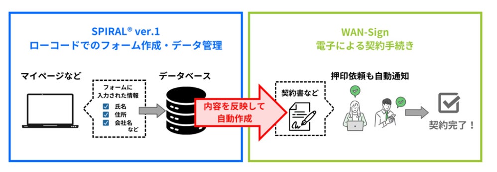 デジタルで未来最適をリードするスパイラル株式会社(東京都港区、代表取締役 CEO 佐谷 宣昭)は、当社の主力製品であるローコード開発プラットフォーム「SPIRAL ver.1」と、株式会社NXワンビシアーカイブズ(東京都港区、代表取締役社長 高橋 豊、以下「NXワンビシアーカイブズ」)が提供する電子契約・契約管理サービス「WAN-Sign」の連携を開始したことをお知らせいたします。これにより、金融機関や不動産業界におけるローン手続きのシームレスなプロセスを提供することが可能となります。