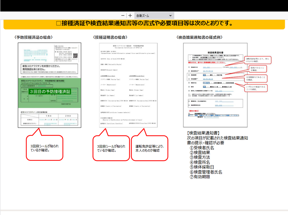 接種済証またはPCR検査等結果通知書(撮影画像、コピー、電子的な証明書でも可)の確認は、同行者も含めて旅行者全員について実施しますので、チェックイン時(旅行会社の場合は予約証明書等お渡しの来店時)にご提示ください。提示のない場合は割引支援を受けることができません。