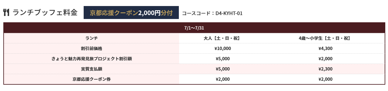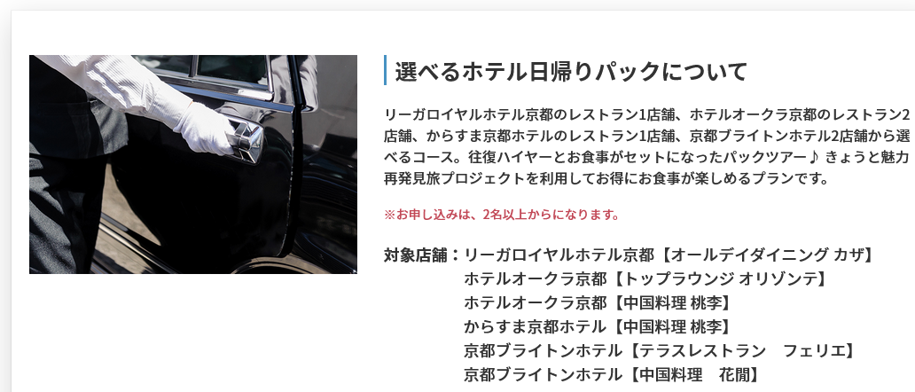 【きょうと魅力再発見プロジェクト】対象商品お一人様づつ2,000円のクーポン付4,000円で豪華ホテルでランチバイキング+往復ハイヤー+クーポンが付いてくるプラン