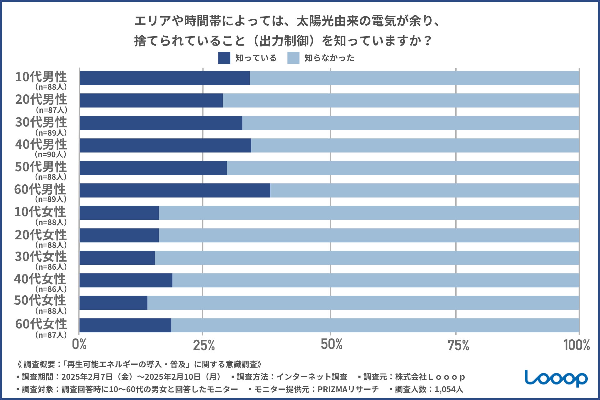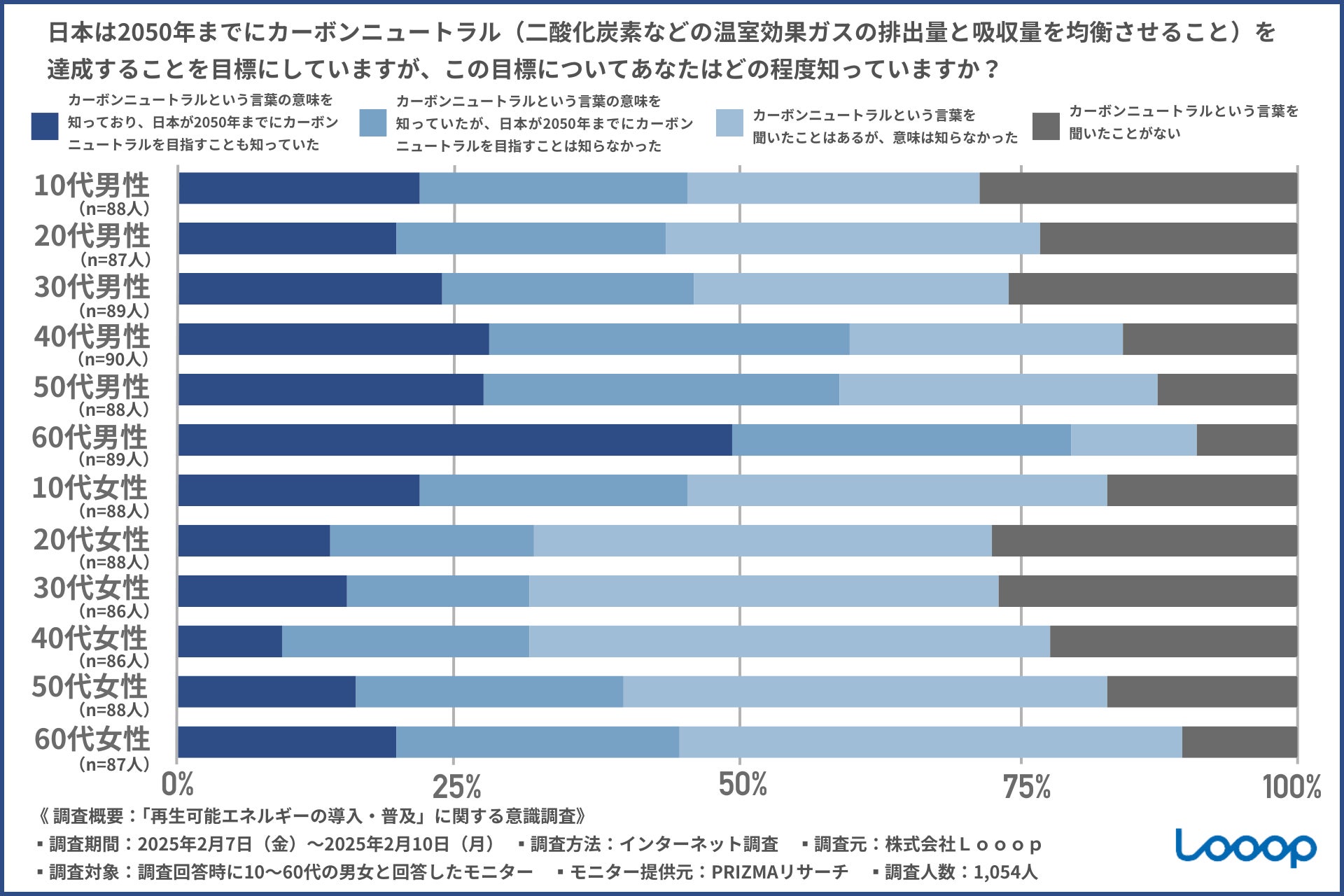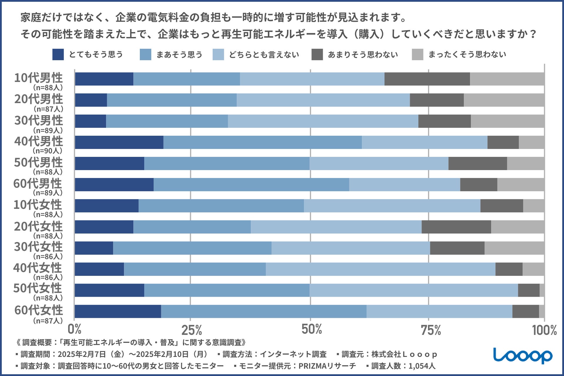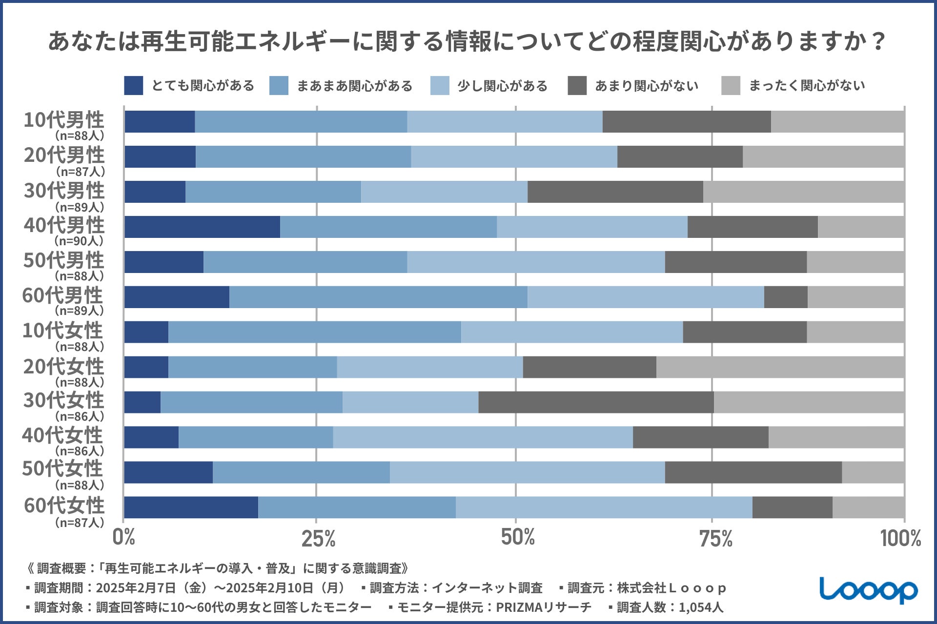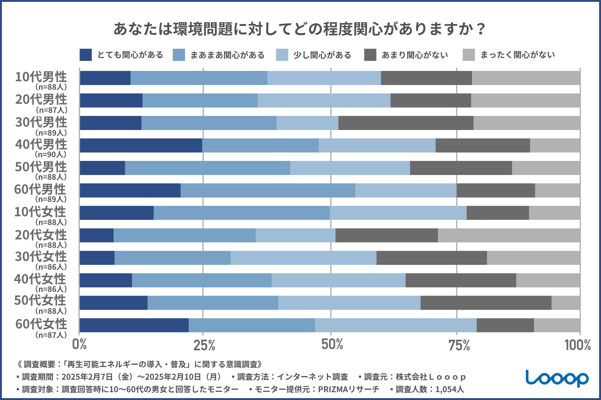 「エネルギーフリー社会の実現」をビジョンに掲げ、再生可能エネルギーのニーズ喚起と普及を目指す株式会社Looop(本社:東京都台東区、代表取締役社長 CEO:森田 卓巳、以下Looop)は、10~60代の男女を対象に、「環境問題・再生可能エネルギー」に関する意識調査を行いました。
