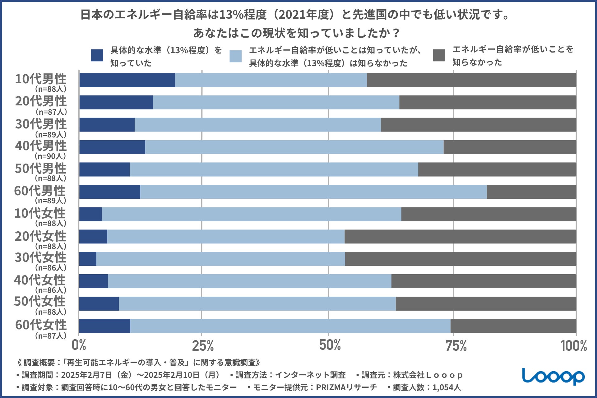 「エネルギー自給率が低いことを知らなかった」という回答は、10代男性、20代女性、30代女性で高い割合となっており、若年層や女性においては特にエネルギー自給率に関する認知度が低いことが浮き彫りになりました。