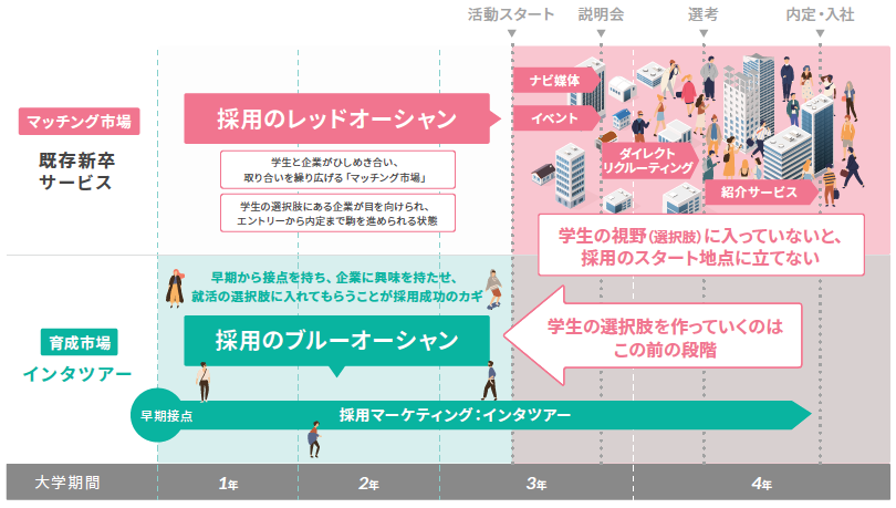 事業内容:新卒採用向けのリレーション採用プラットフォーム「インタツアー」を展開。学生から企業への新しいつながり方を提供する採用マーケティング機能で、新卒採用支援を行っている。
