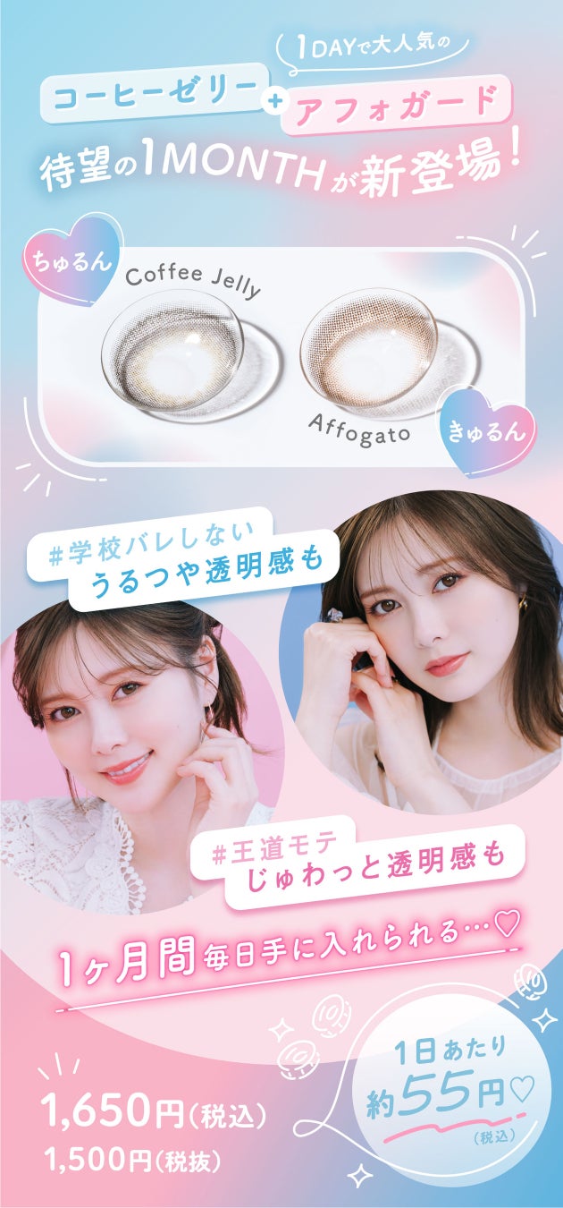 「コーヒーゼリー」はSNS上で「学校でバレないカラコン」として話題になったほどの透明感のあるナチュラルカラコン、「アフォガード」はふわっと甘い瞳になれてシーンを選ばずに使えるカラコンで、feliamo 1DAYをご愛用いただいているお客様よりマンスリー化希望のお声を多くいただいており、この度発売に至りました。