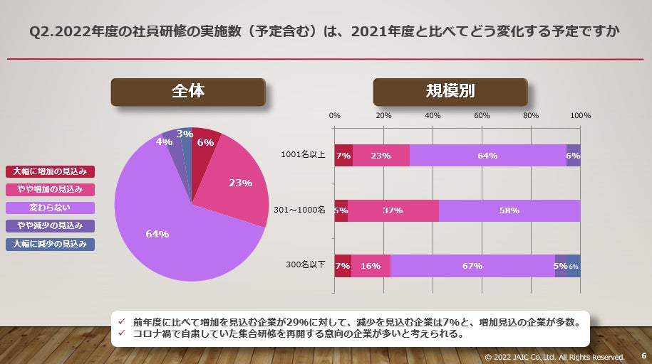 2022年度の教育研修 前年より増加予定が29%に対し、減少予定は7%