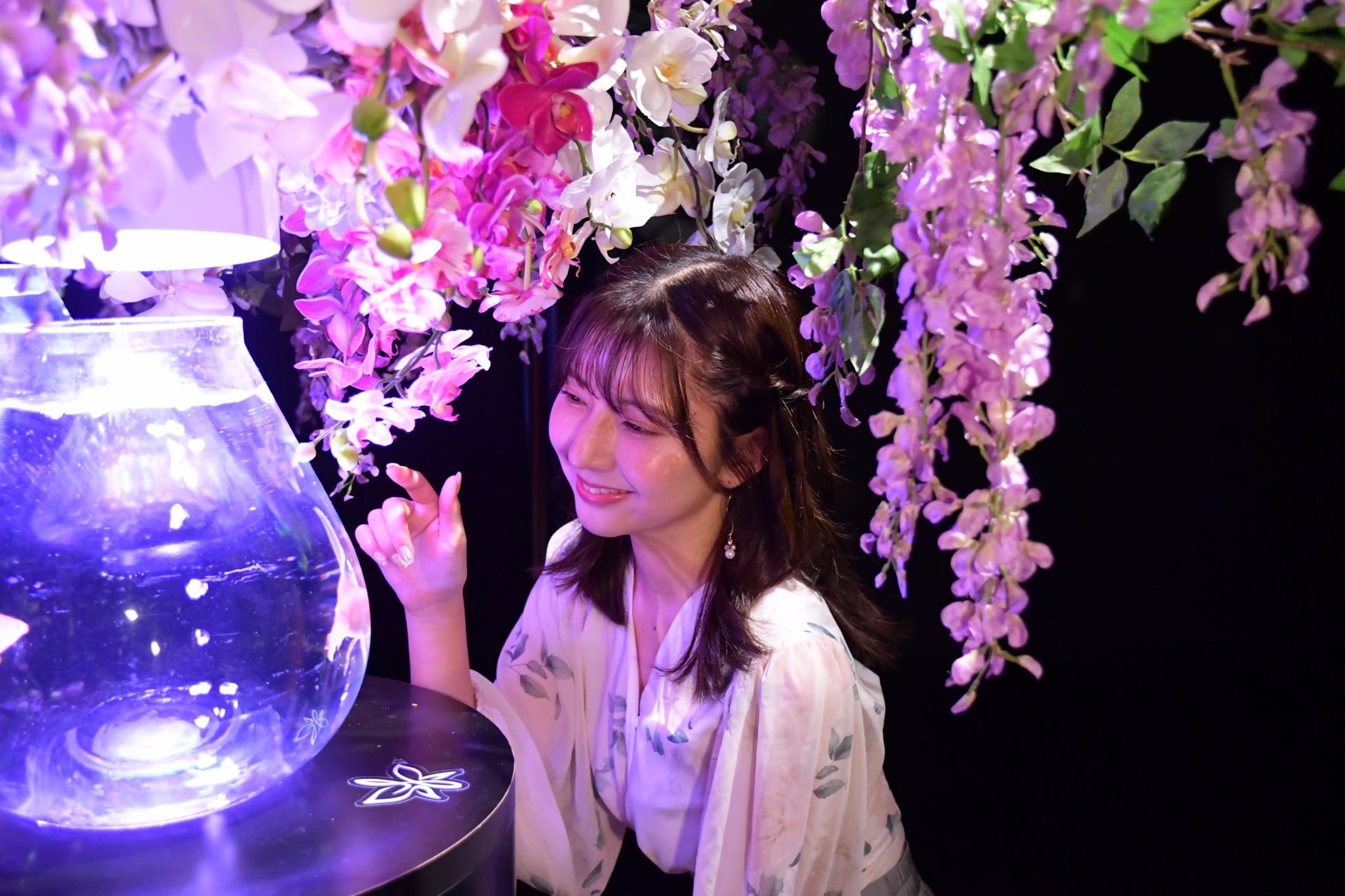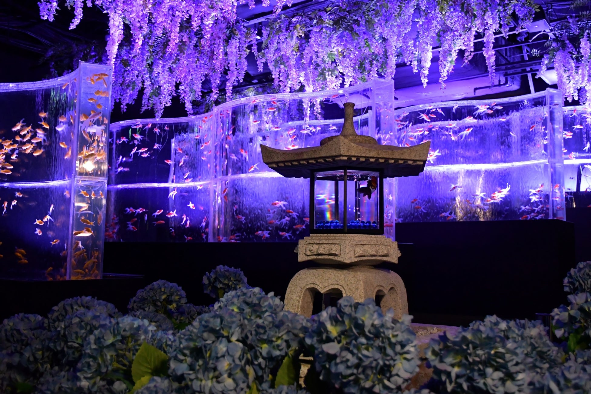 初夏の企画展では、金魚泳ぐ水槽作品が“藤むらさき紫陽花づくし”に染まる、艶空間に!これからの季節を館内で表現した、幻想的な演出が広がります。