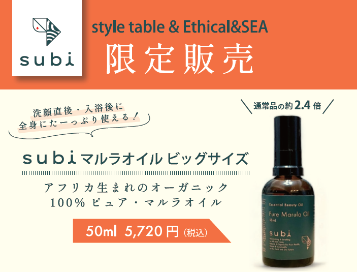 昨年大好評だった subi マルラオイルのビッグサイズ(50ml)を、本数を増やし今年もstyle table・Ethical&SEA にて限定販売いたします。