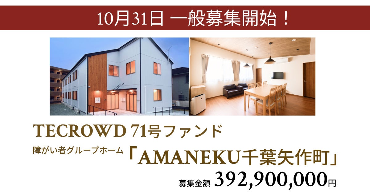 この度新たに71号ファンド障がい者グループホーム「AMANEKU町田野津田町/葛飾東金町」の情報を2024年10月21日より公開し、2024年10月31日18時より募集を開始いたしました。