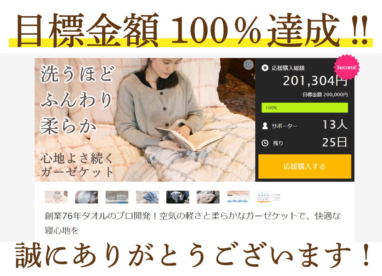 アタラシイものや体験の応援購入サービス「Makuake(マクアケ)」にて開催中のタオル屋が作った″空気のガーゼケット″が、早くも目標金額達成!!