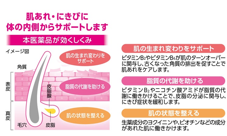 ビタミンB2やニコチン酸アミドが、脂質の代謝に働きかけることで、皮脂の分泌に関与し、にきび症状を緩和します。