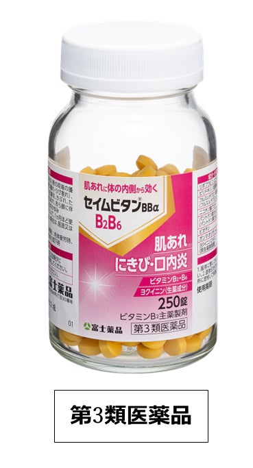 「セイムビタン®BBα」は、皮膚や粘膜の健康を維持する働きのあるビタミンB2・B6、ニコチン酸アミド、パントテン酸、ビオチンに加え、肌あれ・にきびに効果のある生薬のヨクイニンエキスを配合したビタミン剤です。次の3つの作用で、肌あれ・にきびなどの症状緩和を体の内側からサポートします。