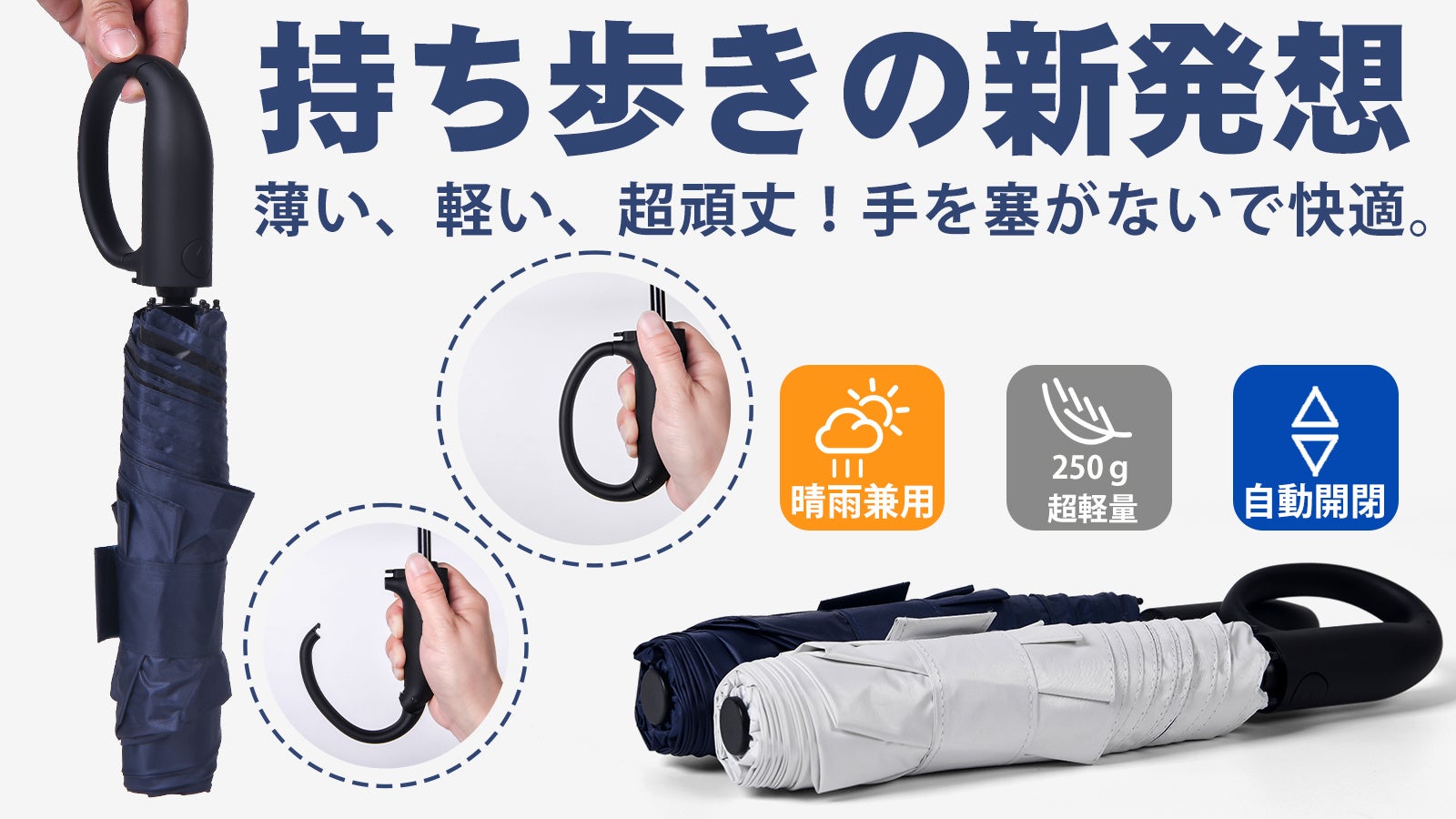 ①【ユニークなリングハンドル】玄関に掛けたり、鞄に吊るしたり、ハンズフリーで快適に持ち運び! ②【スムーズな収納】ワンタッチ自動開閉!余計な力を入れなくてもシャフトを簡単に閉じられる。 ③【晴雨兼用】強風に耐える丈夫さと250gの軽さを両立。雨だけでなくUVカットや遮光にも対応。