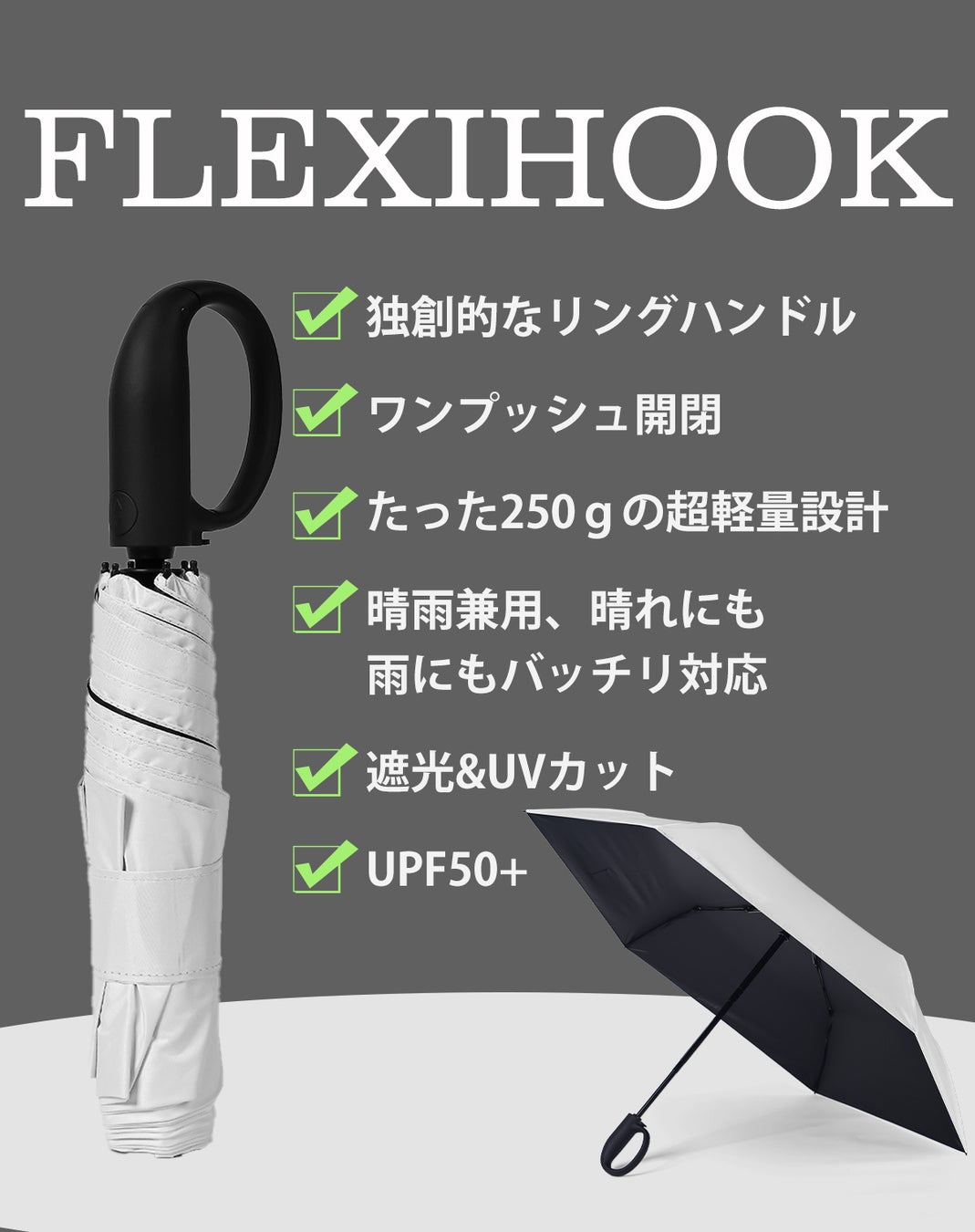 4/21発売開始!大口フックで鞄に吊るせる!究極の軽さと丈夫さを両立、晴雨兼用、超軽量自動開閉傘FLEXIHOOK