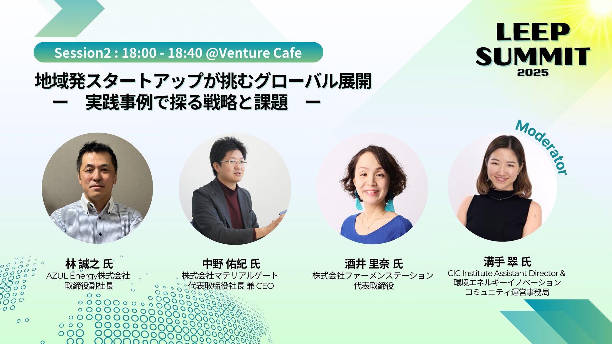 東北、中部、中国地方など日本各地を拠点に環境・エネルギー領域で活躍するスタートアップをお招きし、大企業や各地の産業プレイヤーとの協働事例、グローバル展開に向けた具体的な取り組みを紹介します。地域の産業基盤を活かした技術開発から、大企業との連携による実証、そして海外市場への挑戦まで、リアルな戦略と直面した課題を登壇者が本音で語ります。