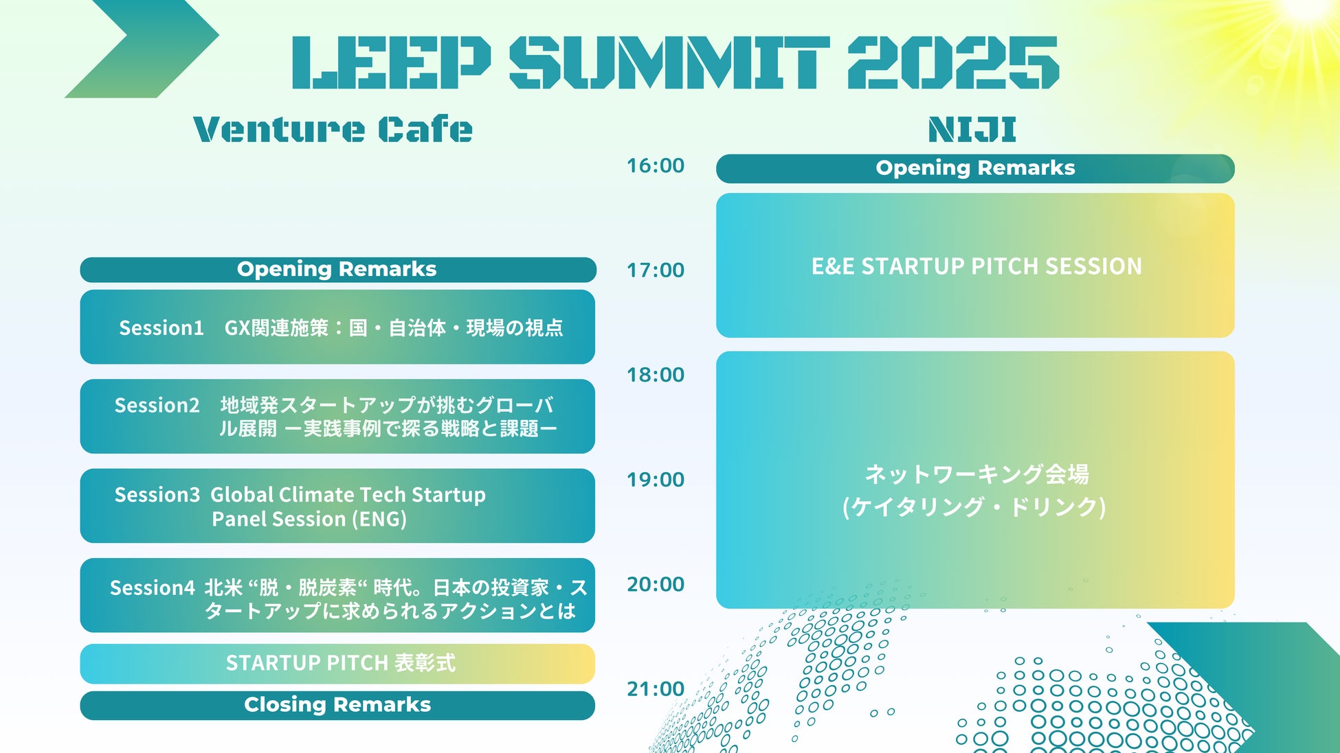 LEEP SUMMITはE&Eコミュニティが実施する年間最大のイベントで、今年で5度目の開催となります。今年度のLEEP SUMMITでは「環境エネルギー "共創と実践" -国と都市を越えて- 」をメインテーマに、日本各地のスタートアップや各地で活躍するベンチャーキャピタル、海外の気候テックスタートアップが集結します。国内外の最前線で活躍するプレイヤーによるピッチ、パネルディスカッション、ネットワーキングを通じて、実践的なイノベーション創出につながる機会を提供します。本分野に興味のある企業、スタートアップ、起業家、研究者、大学や研究機関、官公庁、自治体、投資家など、数多くのプレイヤーが一堂に会するイベントになりますので、ぜひご参加ください。