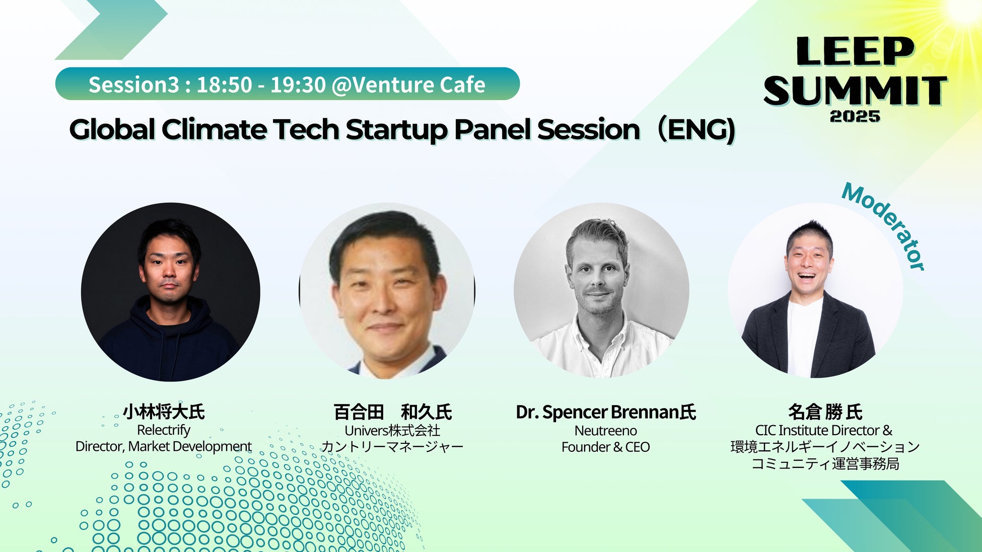英国・シンガポール・オーストラリア発の気候テックスタートアップが、各国の気候テック領域の最新トレンド、ポリシーチェンジ、それらを踏まえた課題や海外展開の鍵について迫ります。また各社が日本展開に向けてどのような期待を持っているか、ディスカッションします。