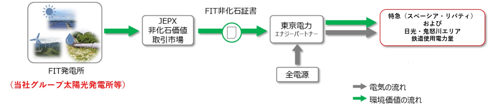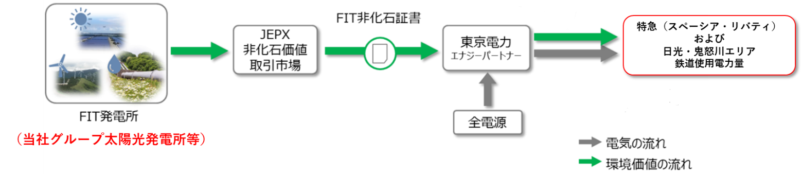 本施策では、東京電力エナジーパートナー㈱のFIT非化石証書を活用したメニューなどを使用し、一部の電力はトラッキング付FIT非化石証書を用いることで、東武グループが保有する太陽光発電由来の環境価値が付いた電力を活用するほか、沿線地域の太陽光発電の環境価値も積極的に取り込み、地域の脱炭素化に貢献します。