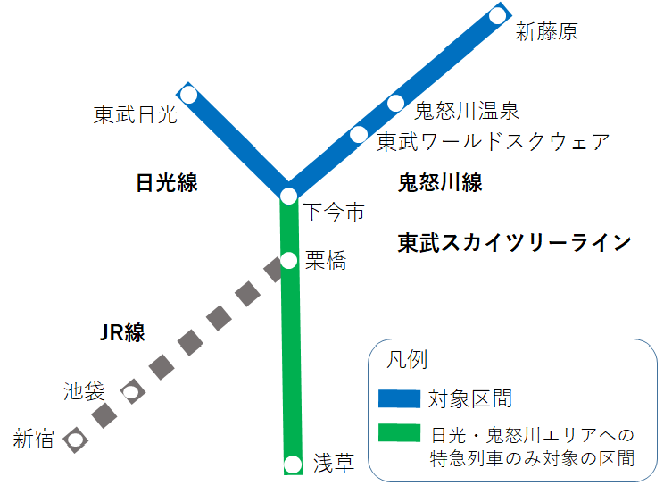 (3)浅草~日光・鬼怒川エリア間で運行している特急リバティ・スペーシアなどすべての特急列車