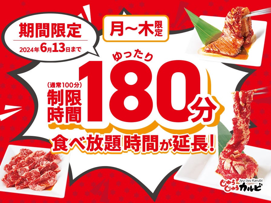 株式会社トマトアンドアソシエイツ(本社:兵庫県西宮市、代表取締役社長:小林 大二)が運営する 焼肉食べ放題「じゅうじゅうカルビ」にて「食べ放題コースの利用時間延長」を2024年5月13日(月)より実施いたします。