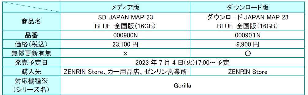 株式会社ゼンリン(本社:福岡県北九州市、代表取締役社長:髙山善司、以下ゼンリン)は、パナソニック製のカーナビGorilla向け更新地図の2023年度版「JAPAN MAP 23」を2023年7月4日(火)からゼンリン公式オンラインショップ「ZENRIN Store」等で販売を開始します。2か月ごとに更新される道路データを2024年6月30日まで無償で更新できるダウンロード版(「ZENRIN Store」のみでの販売)と、SDカードに地図情報を収録したメディア版の2種類の販売となります。