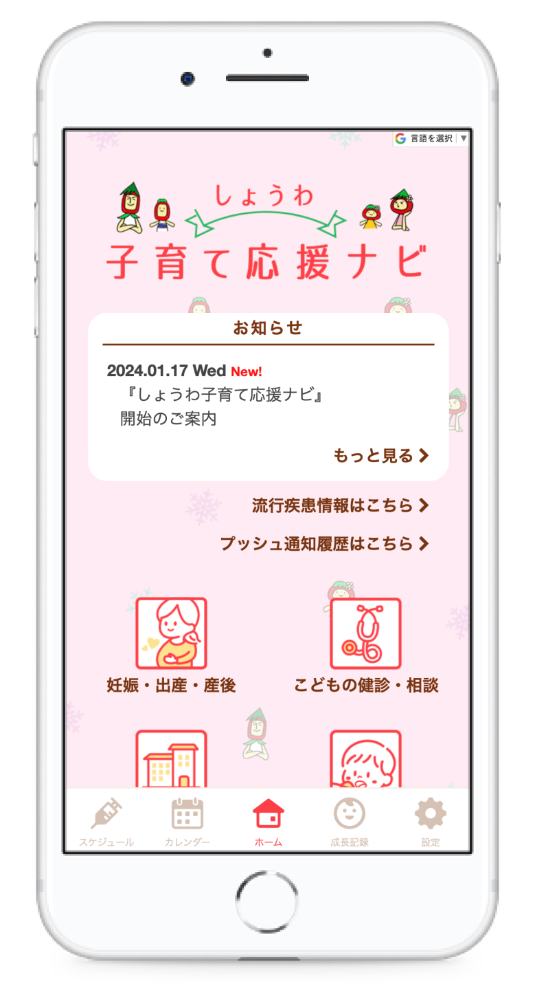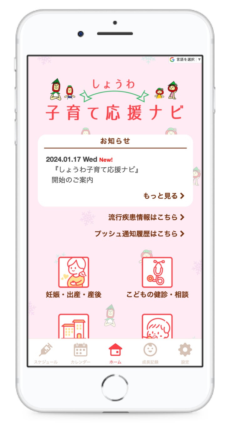 これまでの子育て支援アプリと今回導入する子育てモバイルを統合して、「しょうわ子育て応援ナビ」と命名しました。トップページには、昭和町特産品のいちごをモチーフに、職員が作成した「いちごさん一家」が登場。昭和町らしさが詰まった こだわりのデザインでお届けします。