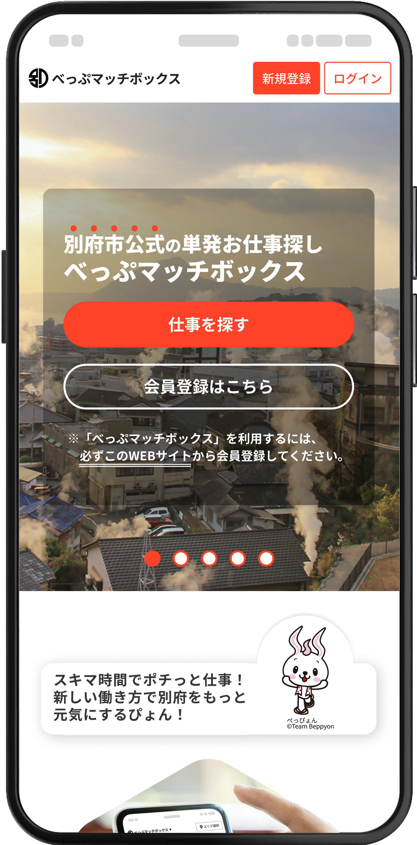 「べっぷマッチボックス」は、別府市公式のスポットワークサービスです。求職者はスマートフォンなどから手軽に求人を検索し、簡単に応募することができます。自身の都合や希望に合わせ、1日・数時間単位での柔軟な就労が可能なため、子育て中の女性、学生、シニア層など、幅広い層の求職者がそれぞれのライフスタイルに合わせて活躍できます。また、市が運営するため信頼性が高く、休業手当の自動支払いといった労働者保護の仕組みやトラブル時のサポート体制等も整備されており、安心してご利用いただけます。