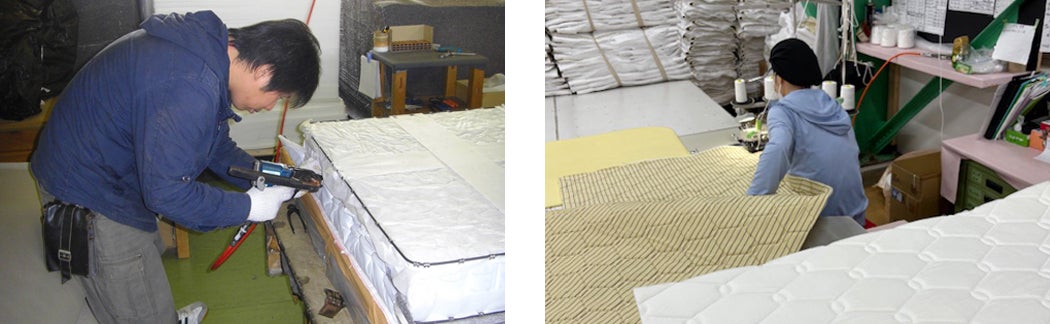 25年以上の経験と総計10万台を超える制作経験と卓越した技術を持つ日本の熟練職人たちが、すべての工程を一つひとつ心を込めて手作業で仕上げています。彼らの繊細な感覚と確かな技術が、マットレスの品質と耐久性を支えています。